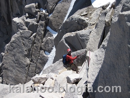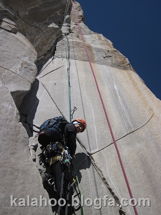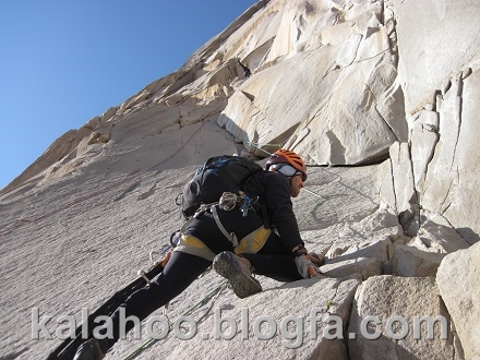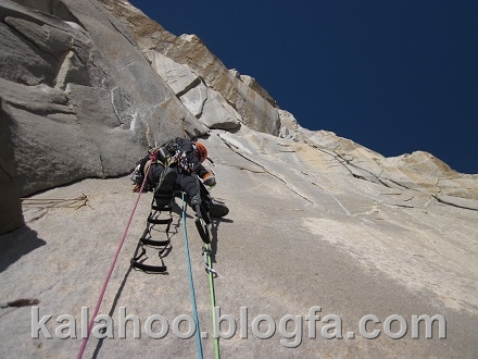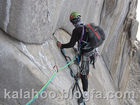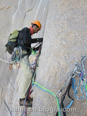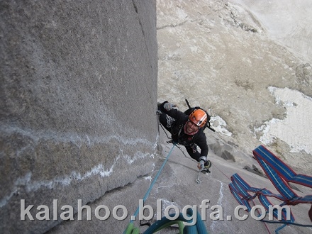 طول ششم کاملا مصنوعی است. این طول را شروع می کنم، فاصله میانی ها تقریبا زیاد است و کاملا بر روی پله آخر رکاب هستم. البته از میخهای قدیمی هم استفاده می کنم که قابل اطمینان هستند. بعد از 35 متر به کارگاه معلقی می رسیم. این همان طولی هست که از آن طنابی به کارگاه بالای کلاهک مسیر 52 لهستان کشیده شده بود.