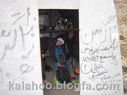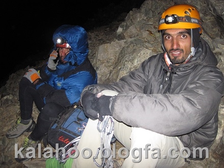 حال به دهلیز آخر رسیده ایم، شهرام بالا می رود و ساعت 10 شب را نشان می دهد و بعد او من و محسن، نهایتا ساعت 11 از دیواره و ریزشی ها خارج می شویم. کمی استراحت می کنیم و بعد از خبر صعود به خانواده و دوستان به سمت جانپناه سیاه سنگها می رویم.