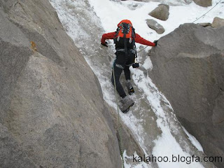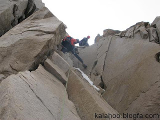 در ادامه مسیر به علت وجود برف تازه و یخ در دهلیزهای مسیر کار را کمی مشکل تر کرد ولی تیم ما مصمم به مسیر ادامه می داد تا اینکه به قبل از سنگ معروف سماور رسیدیم که مسیرش پوشیده از یخ و برف بود. این دو طول تا سنگ سماور را دوست عزیزم علی نصیری که به تازگی از گاشربروم 2 برگشته صعود کرد که در مسیرهای یخی با تبر یخ صعود می کرد و من هم در انتهای طناب ابزارهایی که در مسیر کار گذاشتیم را جمع می کردم.